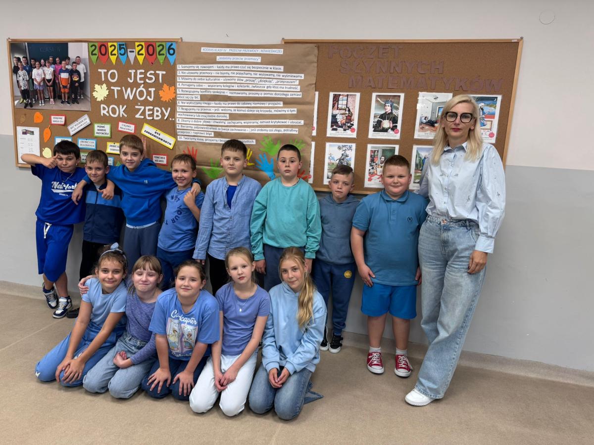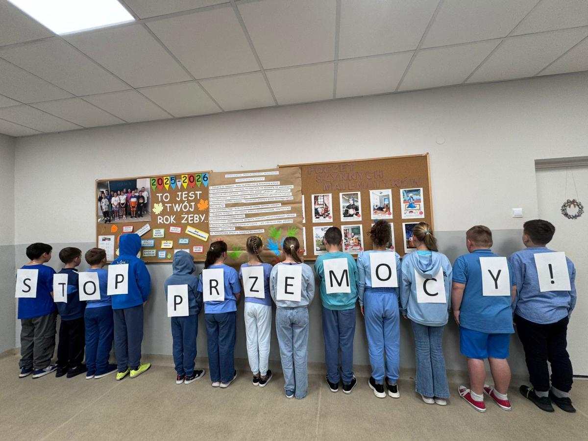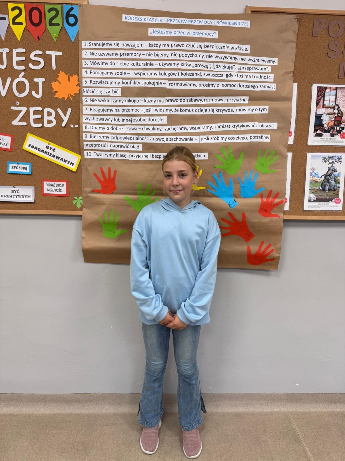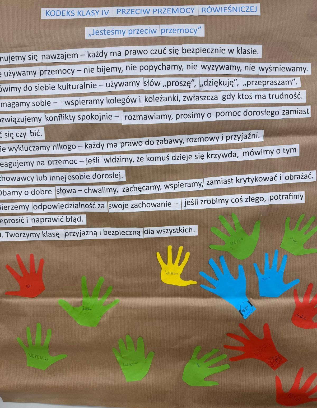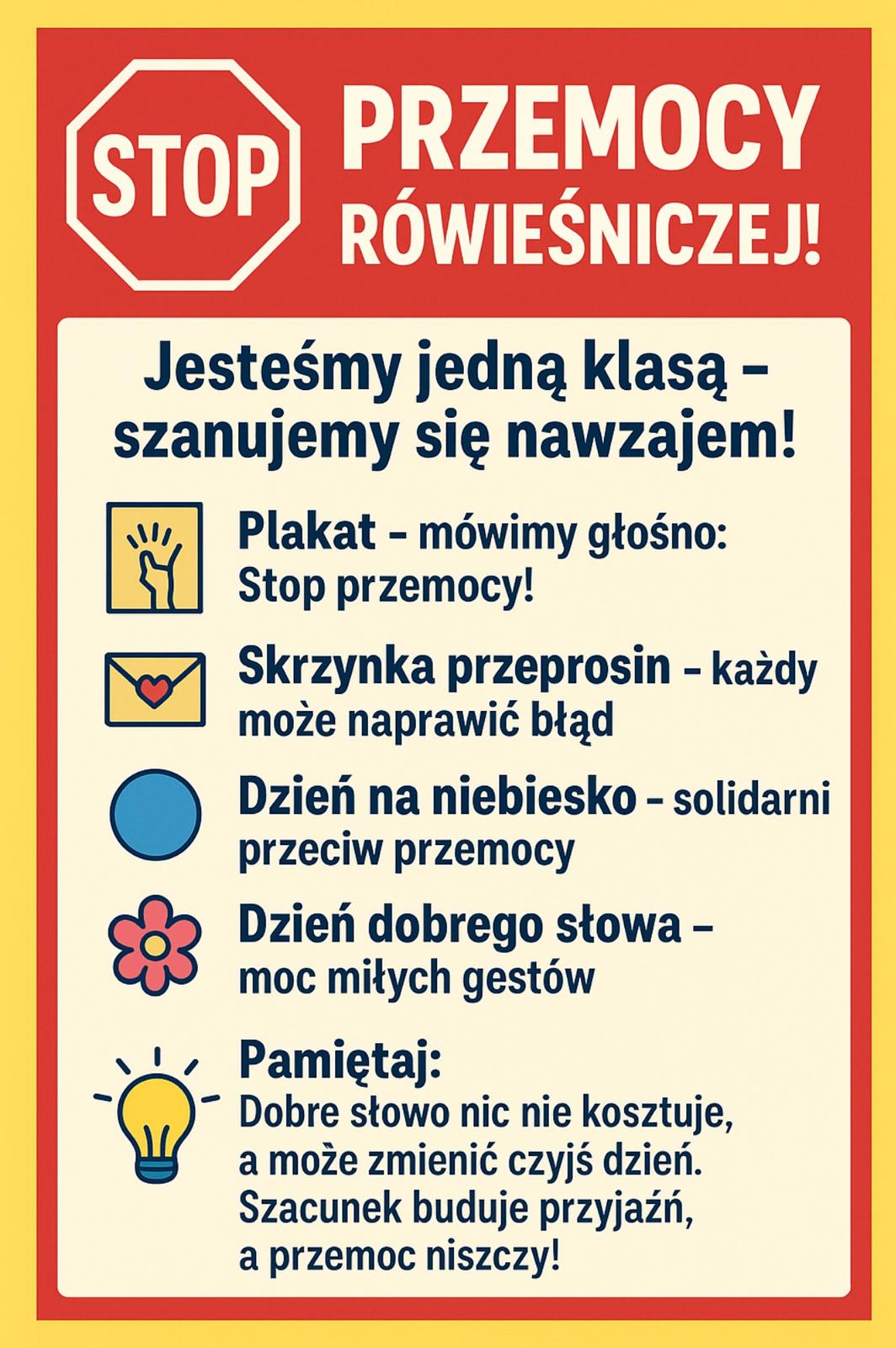 W naszej szkole odbył się Tydzień Przeciwdziałania Przemocy Rówieśniczej, w którym aktywnie uczestniczyła klasa IV. Był to czas pełen ważnych rozmów, refleksji i działań, które miały na celu uświadomienie nam, jak istotny jest wzajemny szacunek, życzliwość i umiejętność rozwiązywania konfliktów bez agresji. Jednym z działań był pomysł na „Skrzynkę przeprosin”. Każdy mógł wrzucić do niej karteczkę z przeprosinami za swoje zachowanie – drobne kłótnie, nieporozumienia czy słowa, które kogoś mogły zranić. Dzięki temu łatwiej było naprawić relacje i odbudować przyjaźnie. Kolejną inicjatywą był „Dzień Dobrego Słowa”. Okazało się, że kilka prostych zdań potrafi poprawić humor i sprawić, że dzień staje się lepszy. Nie zabrakło również działań plastycznych – uczniowie na zajęciach z wychowawcą przygotowali plakat – „Kodeks klasy IV przeciw przemocy” zachęcający do życzliwości i koleżeństwa. Całość zwieńczył „Dzień na niebiesko”. Uczniowie wraz z wychowawczynią przyszli do szkoły ubrani w niebieskie elementy garderoby – kolor, który symbolizuje solidarność w walce z przemocą i krzywdą. Dzięki tym inicjatywom klasa IV pokazała, że potrafi być wspólnotą, w której każdy czuje się ważny i bezpieczny. Tydzień Przeciwdziałania Przemocy Rówieśniczej był dla nas lekcją empatii i przypomnieniem, że dobre słowo, uśmiech, czy gest potrafią zdziałać naprawdę wiele.
