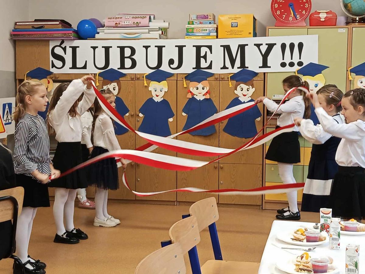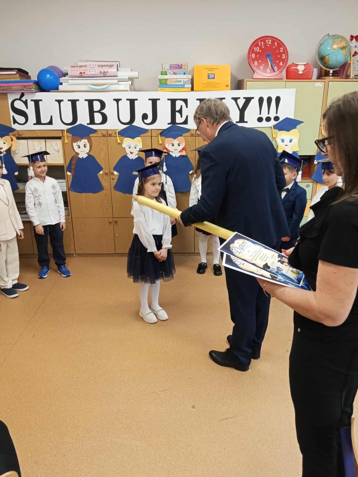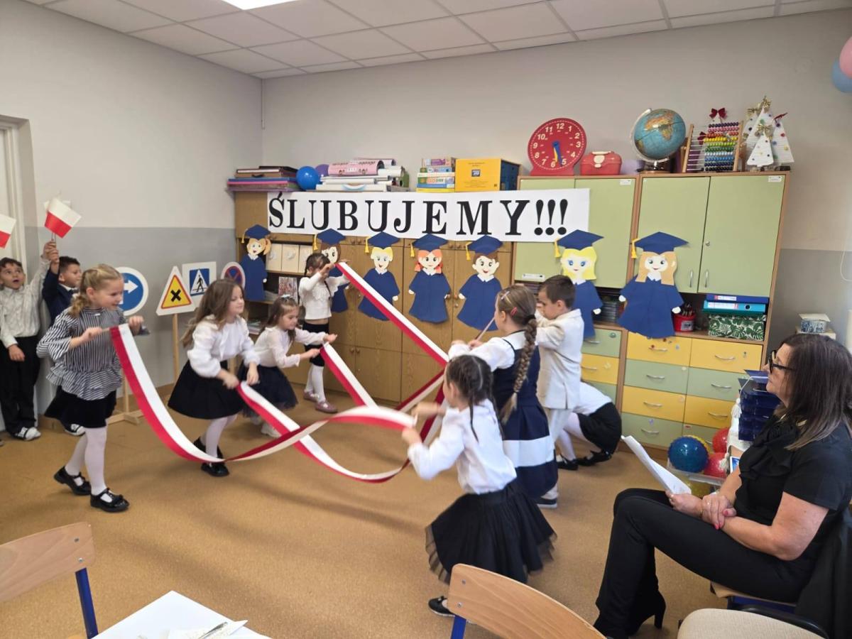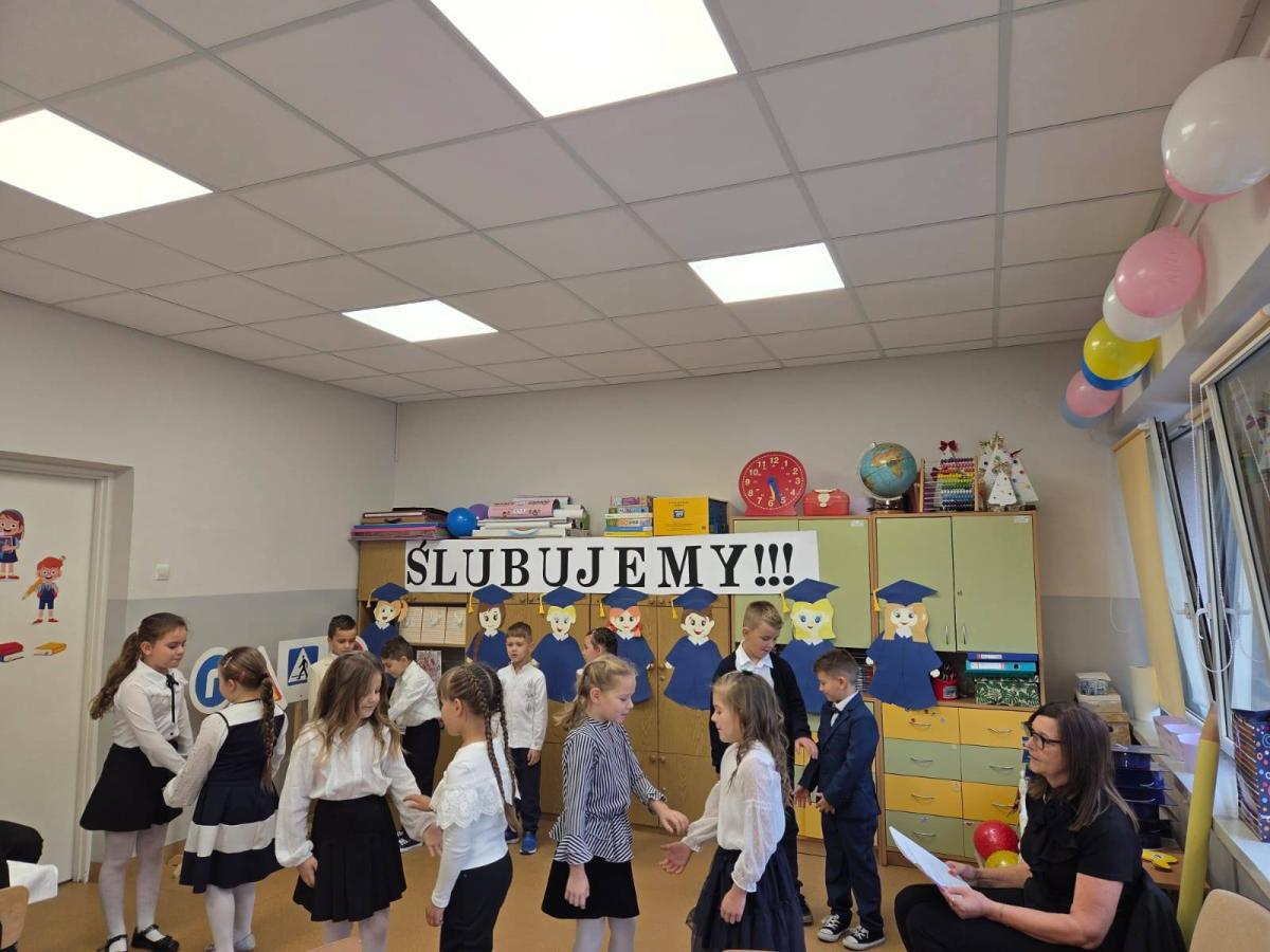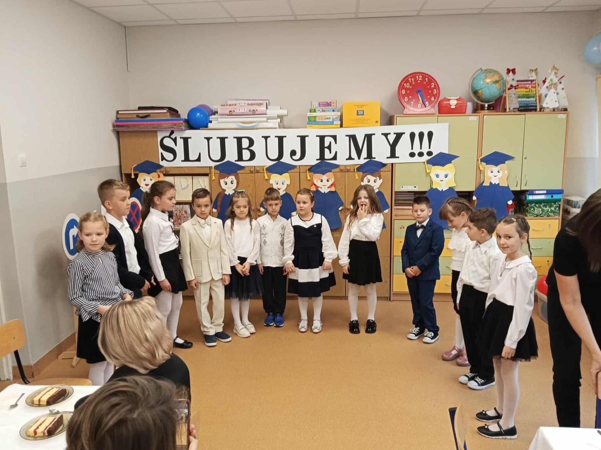 09 października 2025 r. odbyła się w naszej szkole uroczystość Ślubowania i Pasowania na ucznia klasy pierwszej. Pięknie, odświętnie ubrani, przystąpili do zaprezentowania swoich umiejętności. Zanim pierwszoklasiści zostali przyjęci do grona społeczności szkolnej musieli pokazać to, czego się już w szkole nauczyli. Dzieci pięknie śpiewały piosenki, recytowały wiersze i odpowiadały na szereg bardzo ważnych pytań. Po zakończonej prezentacji rodzice i pan dyrektor zgodnie stwierdzili, iż wszystkie dzieci wspaniale zdały „egzamin pierwszoklasisty”.