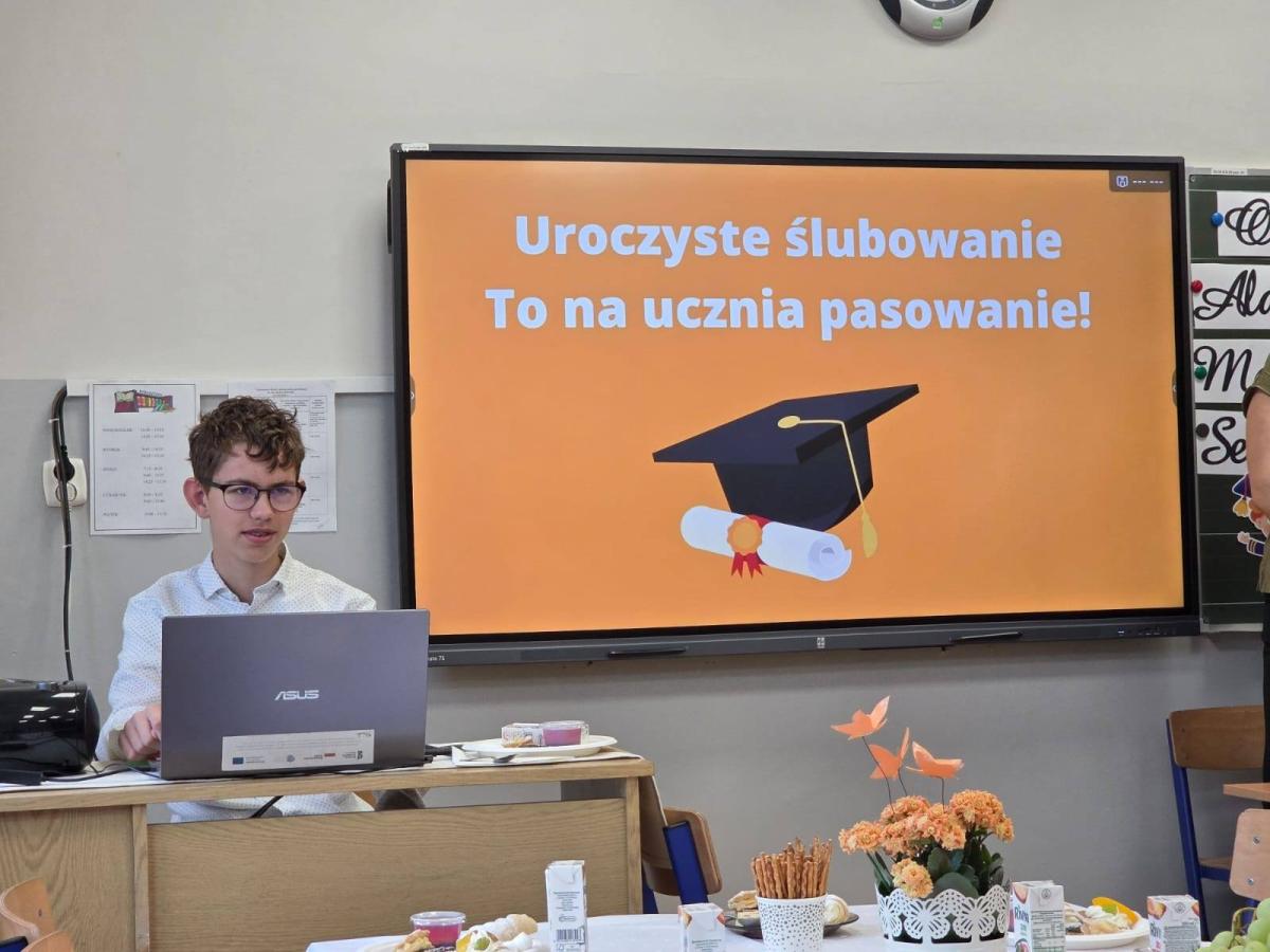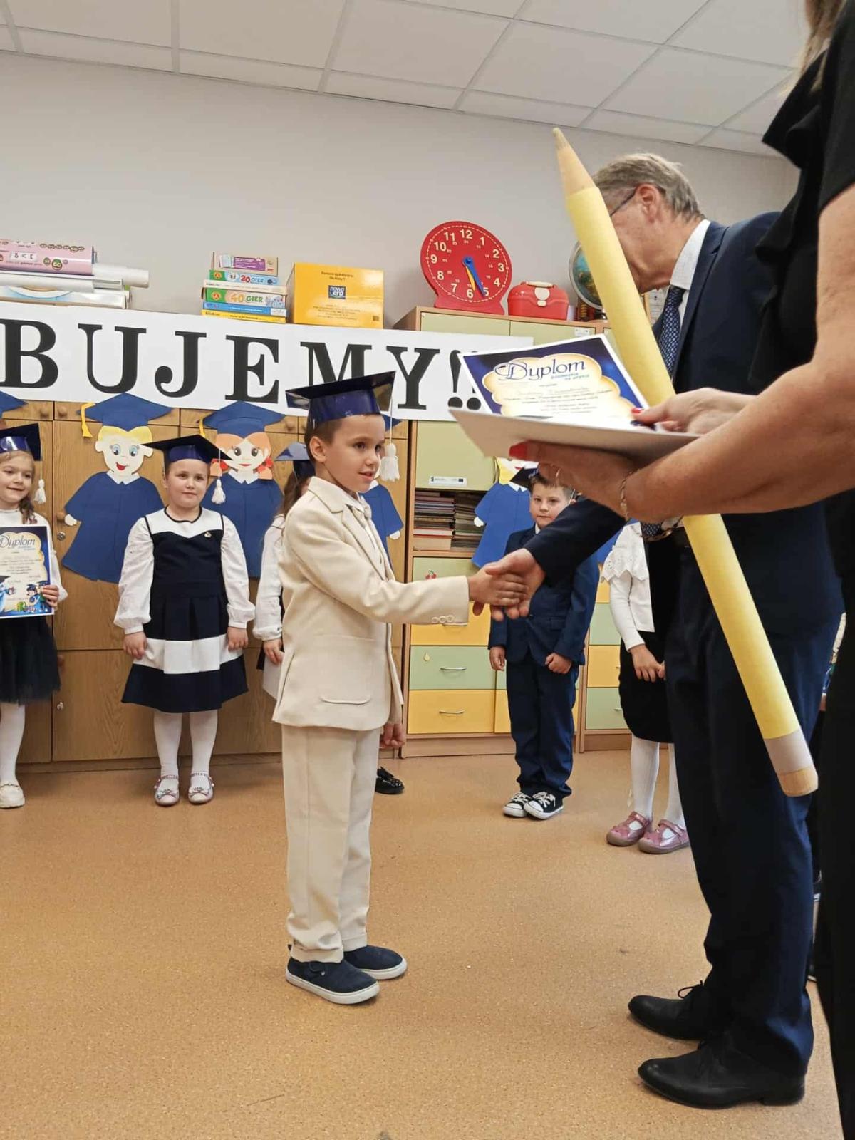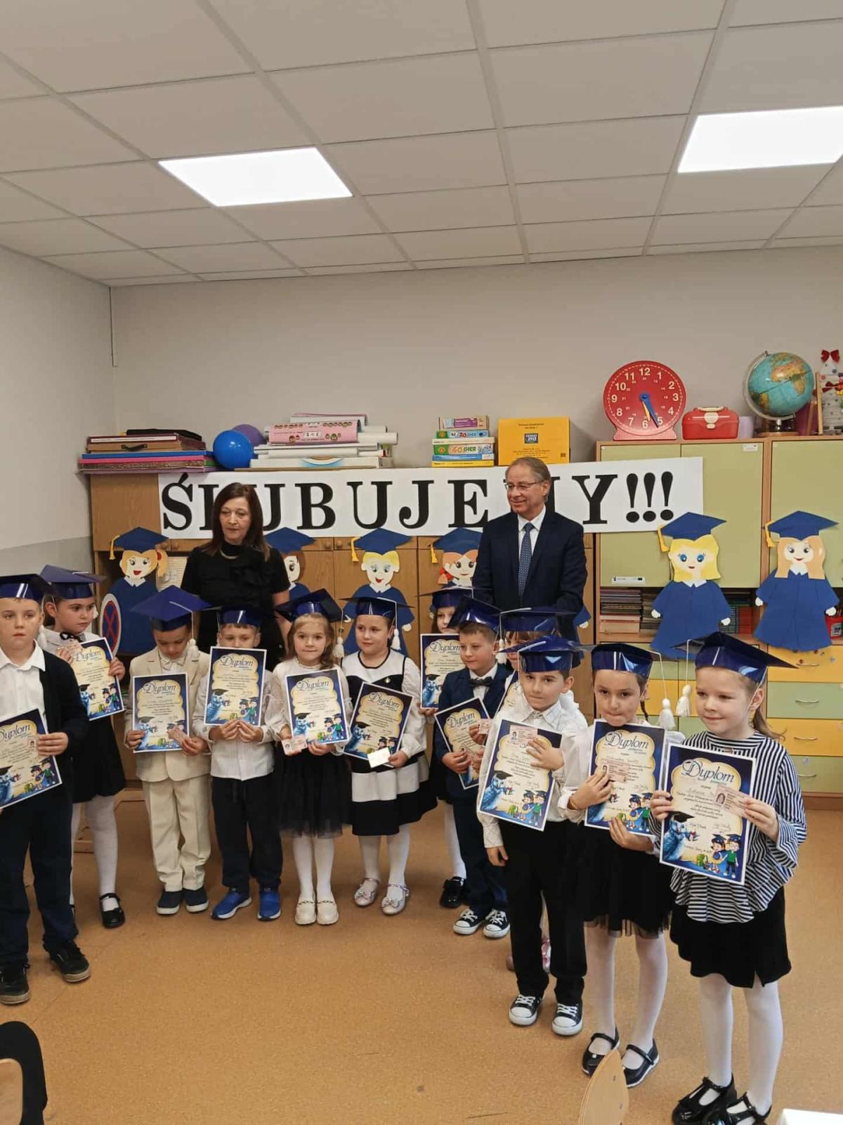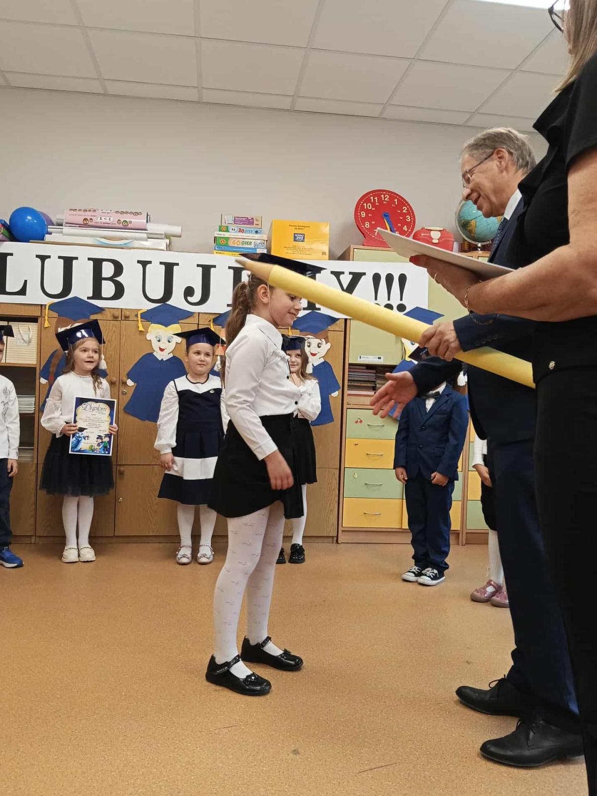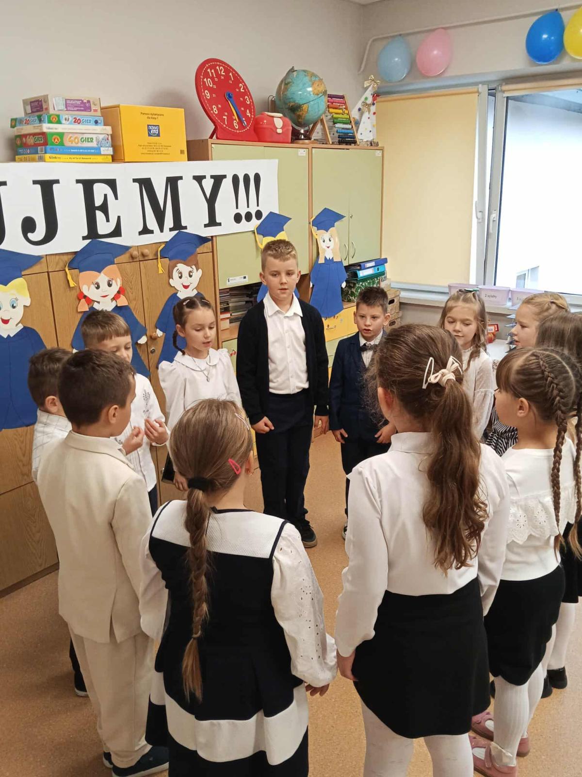 09 października 2025 r. odbyła się w naszej szkole uroczystość Ślubowania i Pasowania na ucznia klasy pierwszej. Pięknie, odświętnie ubrani, przystąpili do zaprezentowania swoich umiejętności. Zanim pierwszoklasiści zostali przyjęci do grona społeczności szkolnej musieli pokazać to, czego się już w szkole nauczyli. Dzieci pięknie śpiewały piosenki, recytowały wiersze i odpowiadały na szereg bardzo ważnych pytań. Po zakończonej prezentacji rodzice i pan dyrektor zgodnie stwierdzili, iż wszystkie dzieci wspaniale zdały „egzamin pierwszoklasisty”.