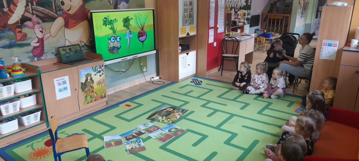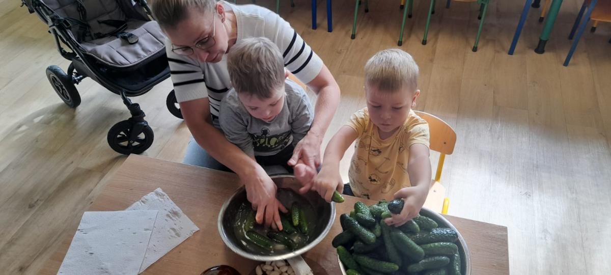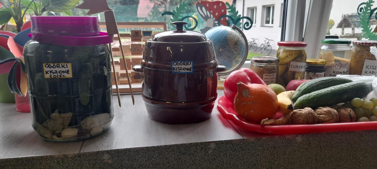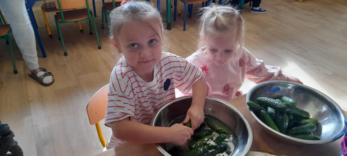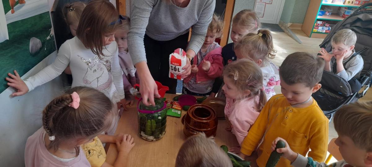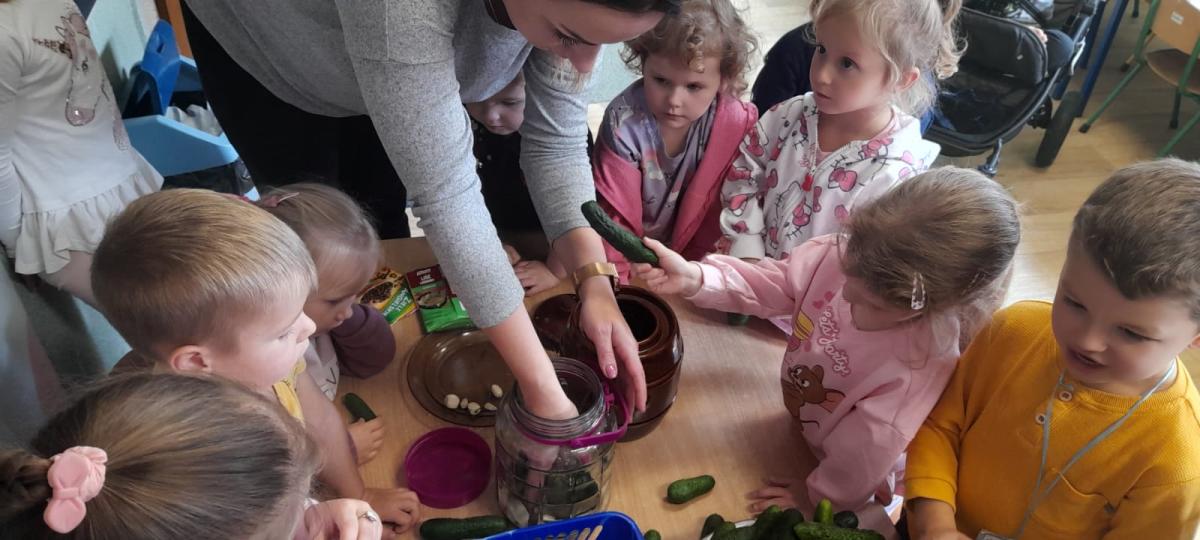 Dnia 16.10.2025 r. w Oddziale Przedszkolnym rozmawialiśmy o warzywach zbieranych jesienią w ogrodzie. Dzieci dowiedziały się jakie warunki są odpowiednie do wzrostu roślin, a także jakie części warzyw są jadalne. Przedszkolaki miały okazję zobaczyć w jaki sposób przygotowuje się kiszone ogórki, które następnie będziemy obserwować aby w końcu móc cieszyć się ich smakiem.