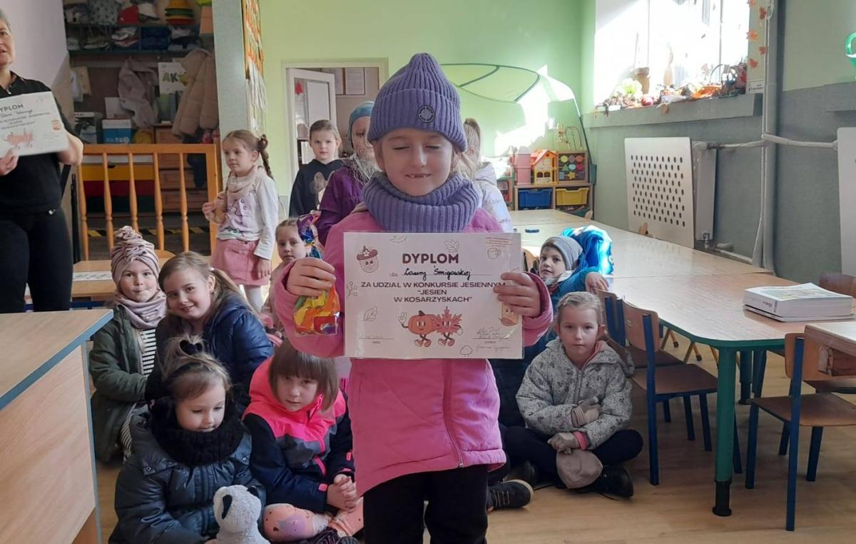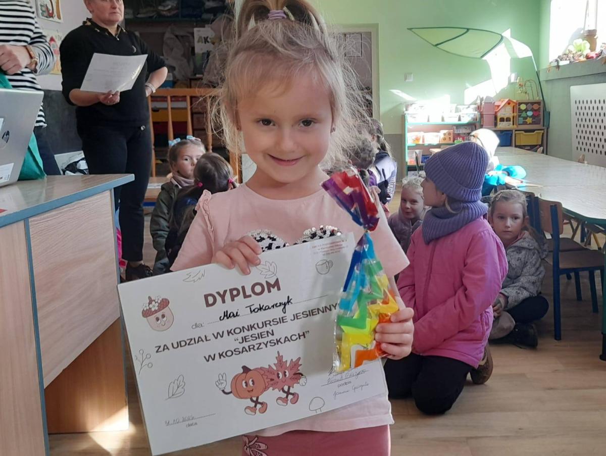 Każde dziecko otrzymało pamiątkowy dyplom oraz drobną nagrodę. Gratulujemy wszystkim uczestnikom i dziękujemy za zaangażowanie w tworzenie prac oddających urok jesieni w Kosarzyskach!