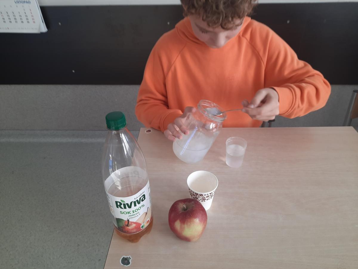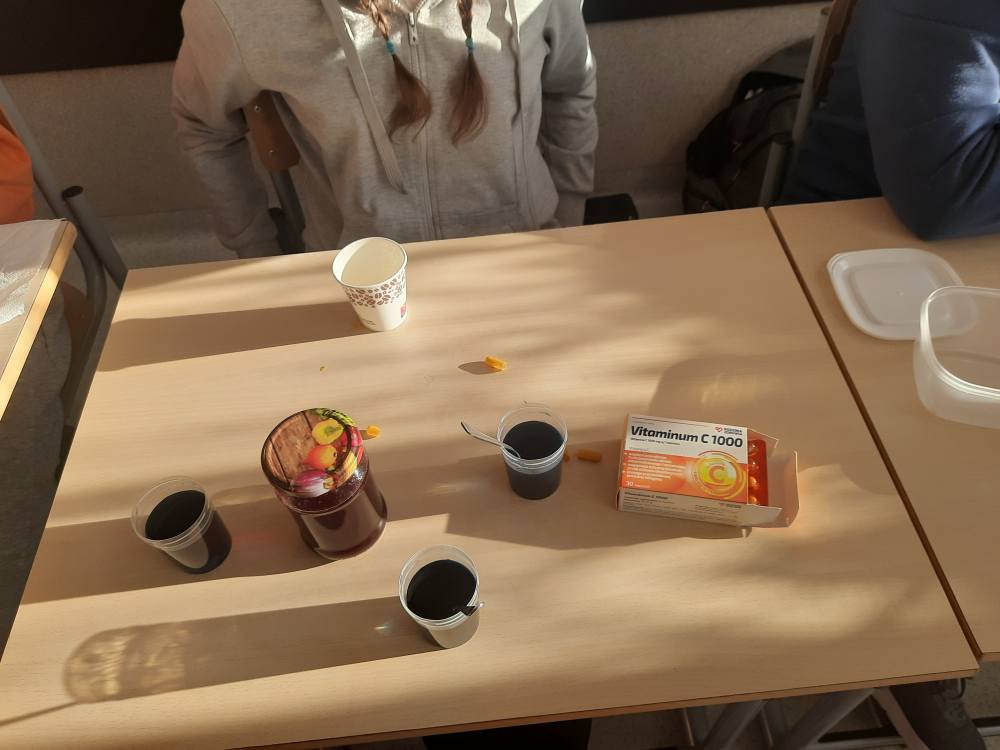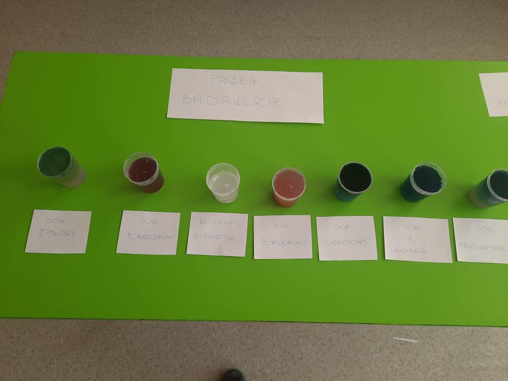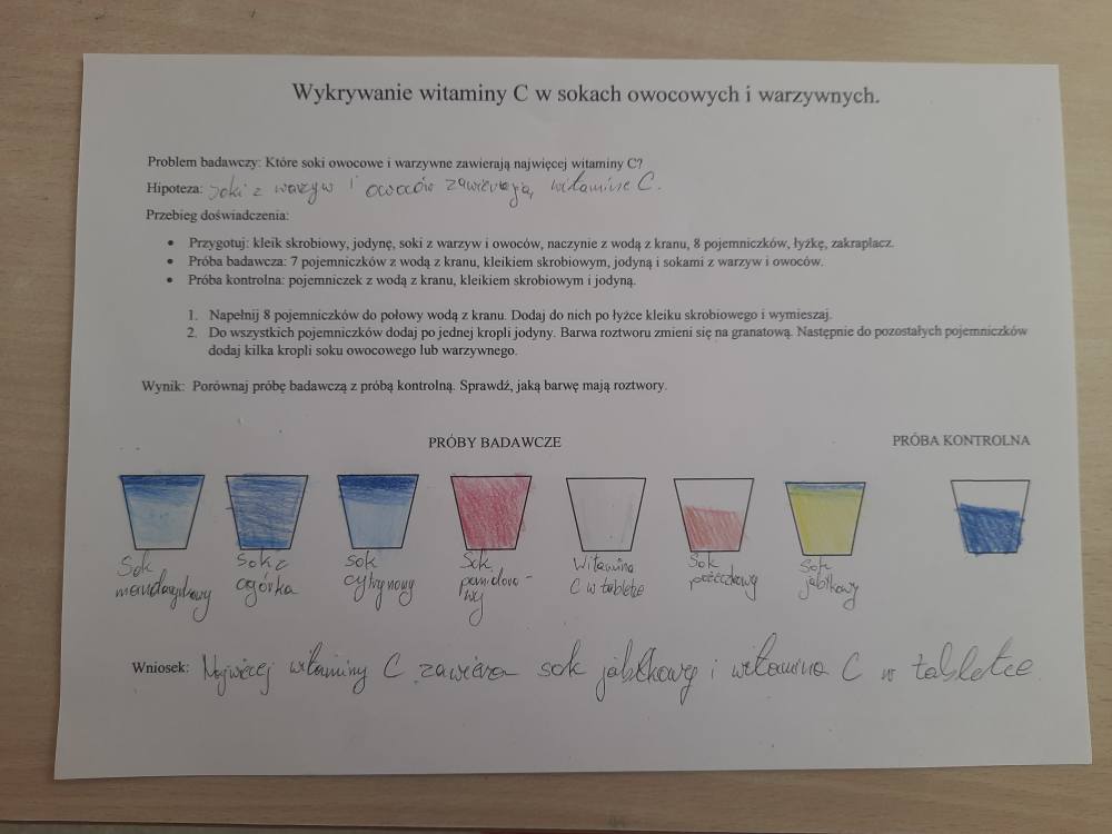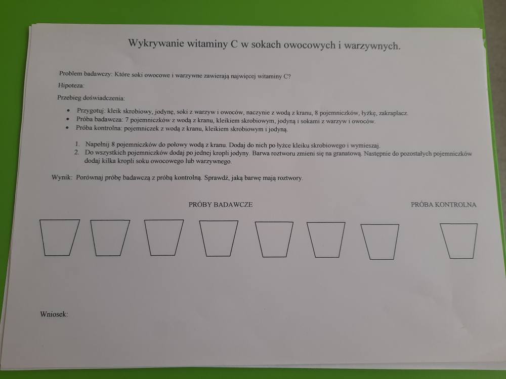 Drukuj Powrót do poprzedniej strony Witamina C - badanie zawartości 06.11.2025 18:35 Treść WITAMINA C Na lekcji biologii, uczniowie klasy VII mieli za zadanie wykonać doświadczenie, które miało na celu zbadać zawartość witaminy C w sokach z owoców i warzyw A.J.
