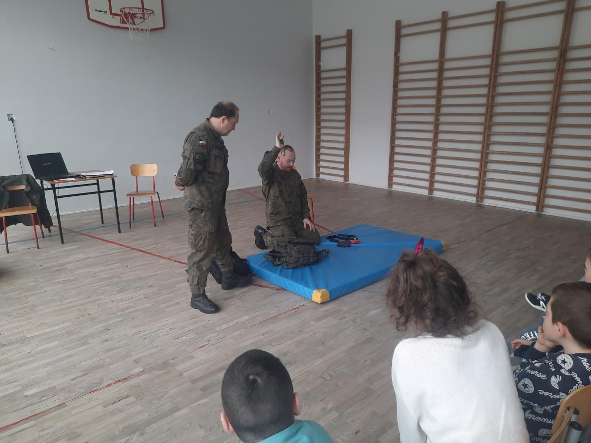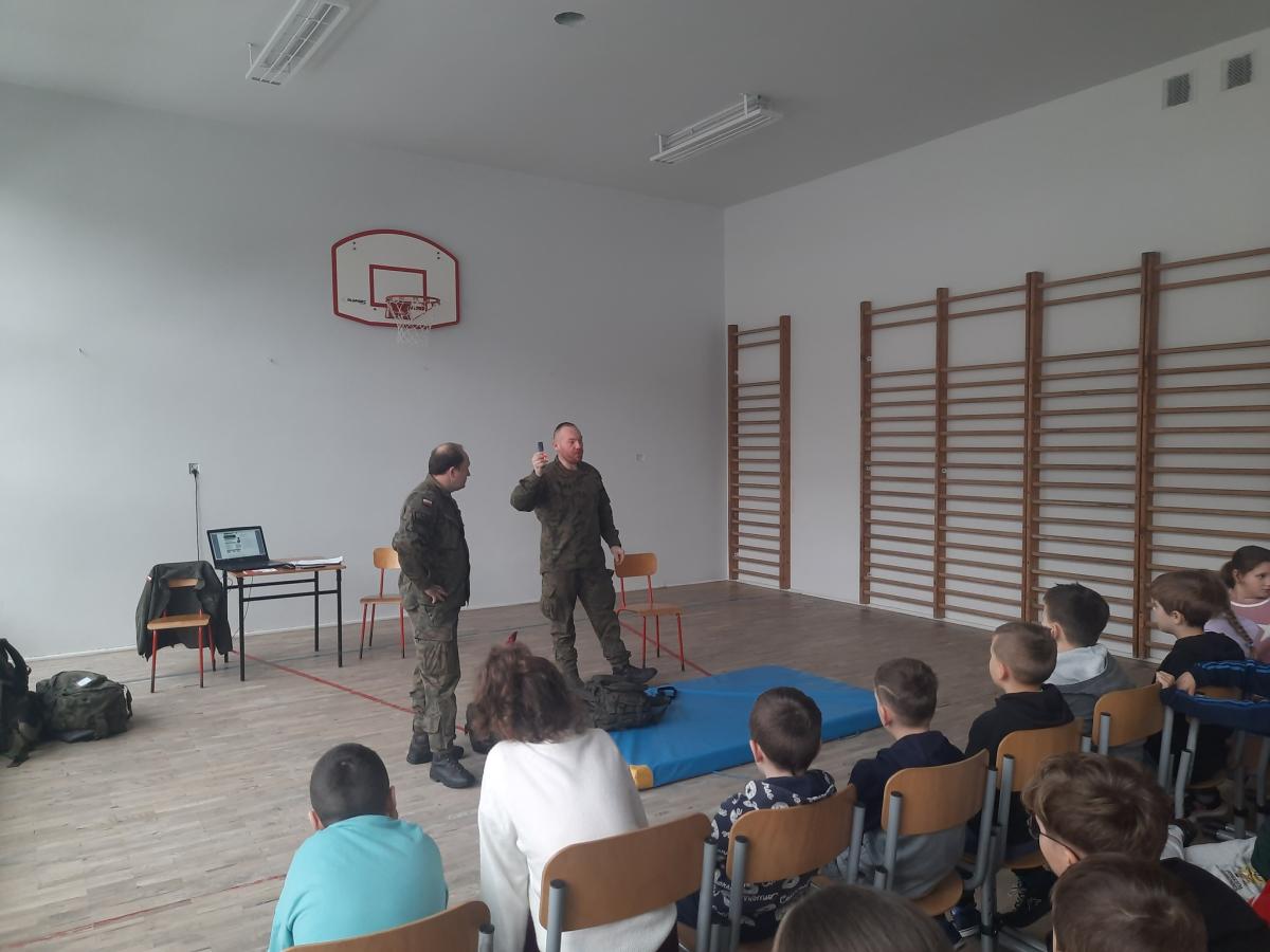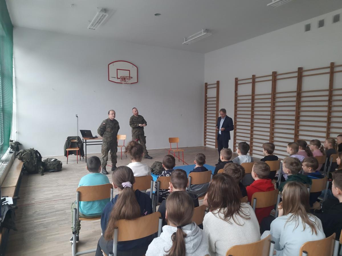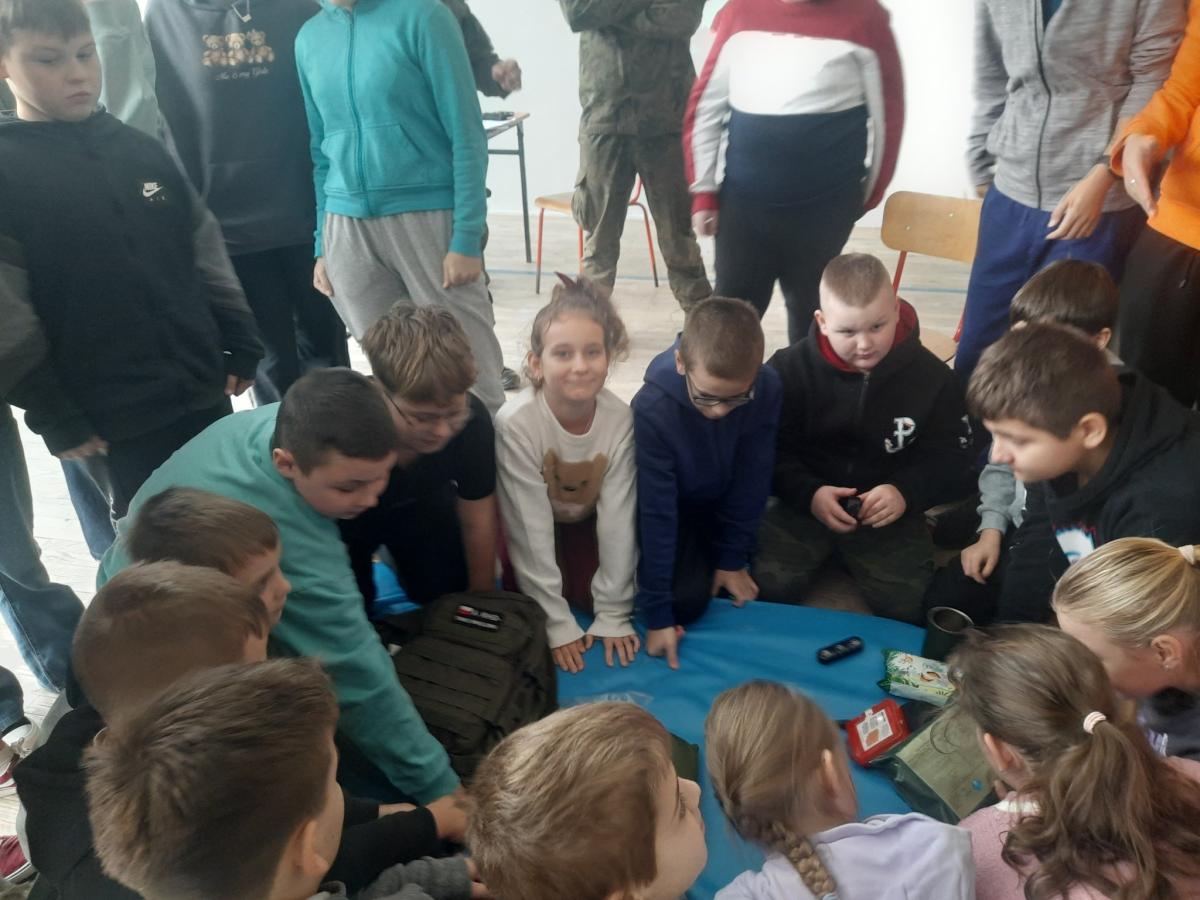 W dniu 02.12.2025r. uczniowie klas IV-VIII brali udział w zajęciach prowadzonych przez żołnierzy Wojska Polskiego. Głównym celem programu jest podniesienie świadomości dzieci i młodzieży w obszarze bezpieczeństwa i obronności. Spotkanie miało również na celu kształtowanie podstawowych umiejętności z zakresu obrony i ochrony, a także odpowiednich zachowań w sytuacjach kryzysowych.