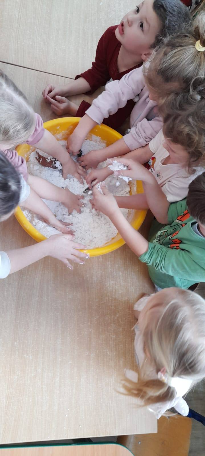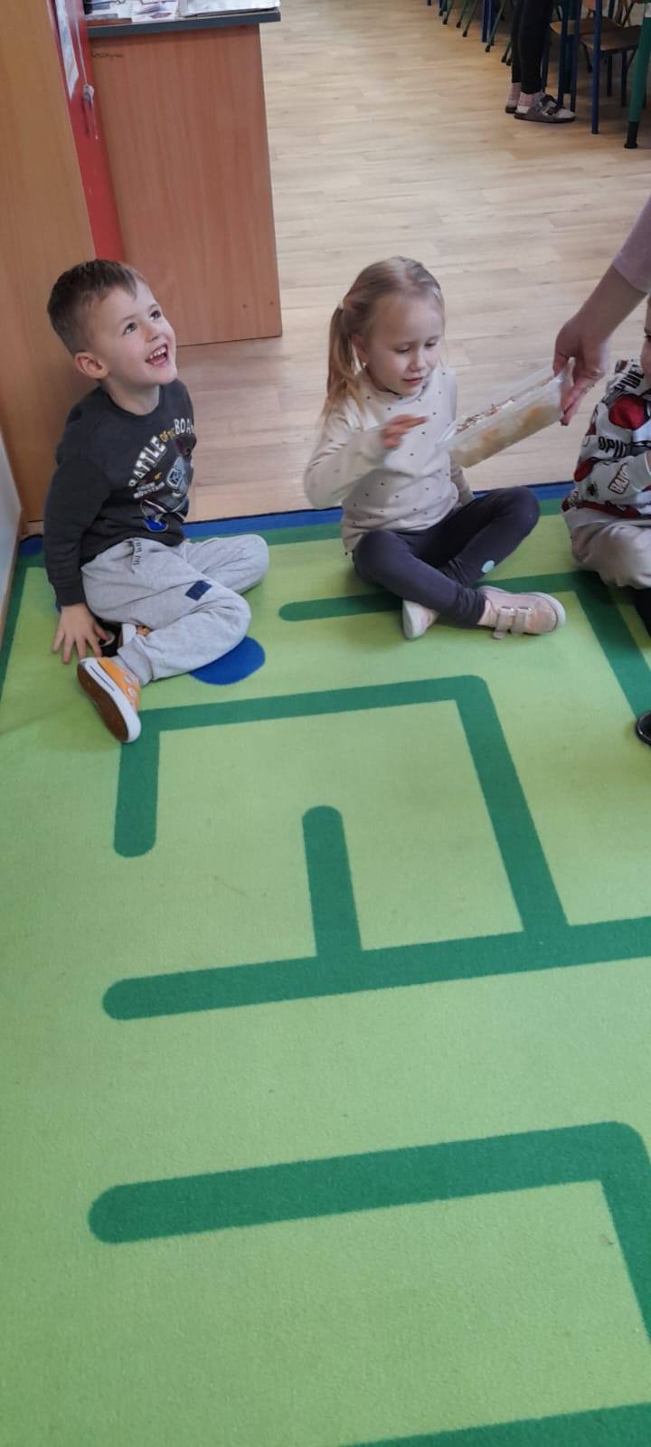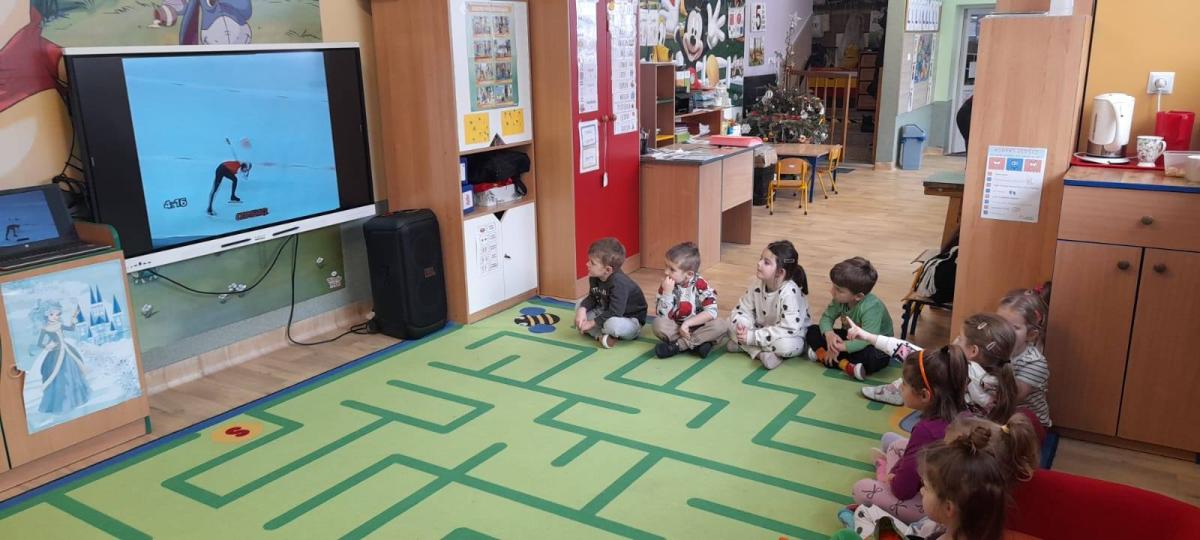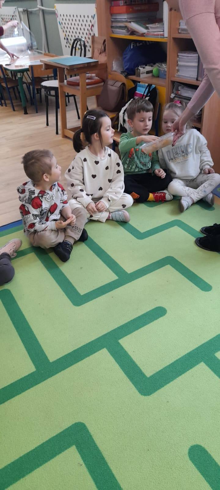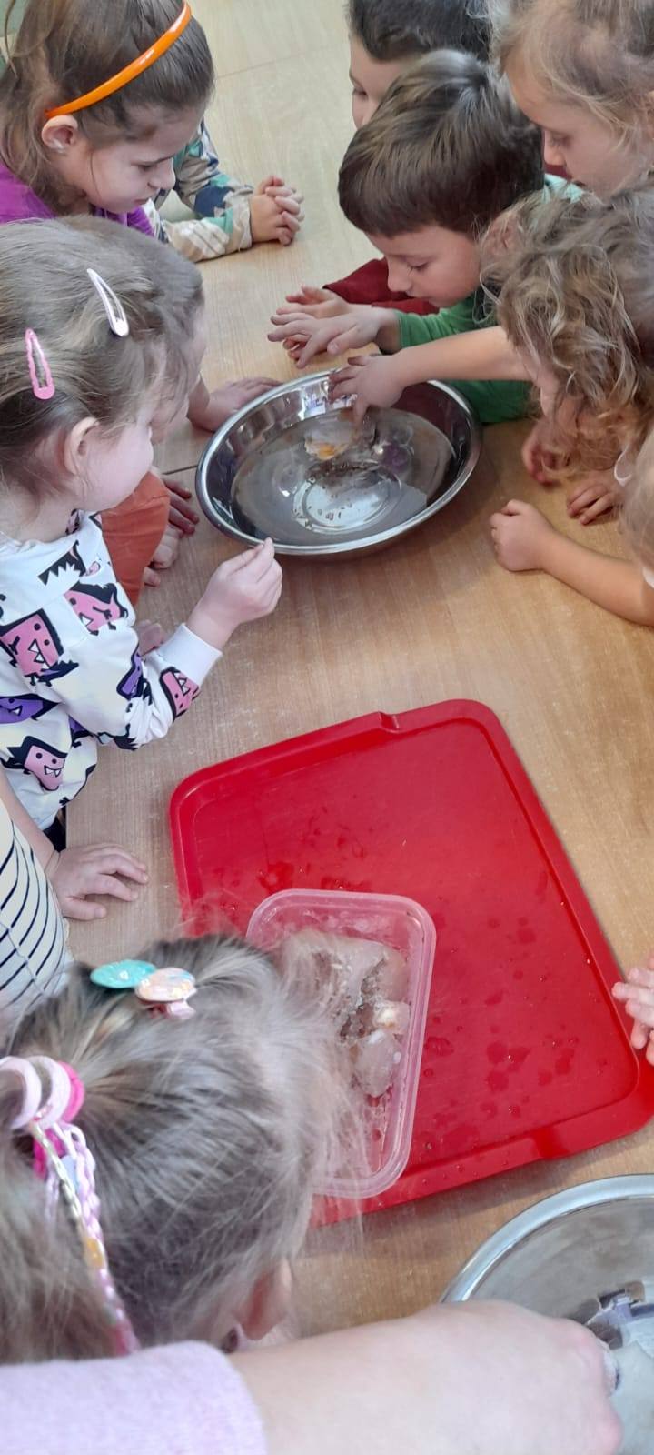 Dzieci poznały właściwości lodu oraz sposoby na jego szybkie roztopienie. W lodowym kawałku znajdowały się przysmaki dla ptaków. Przedszkolaki miały okazję wypowiedzieć się, w jaki sposób zwierzęta zimą mogą wydostać pożywienie z lodu. Wydobyte ziarenka i owoce trafiły do karmnika .