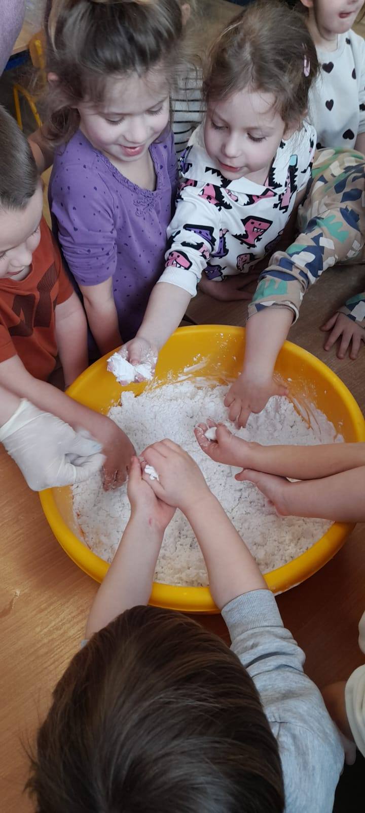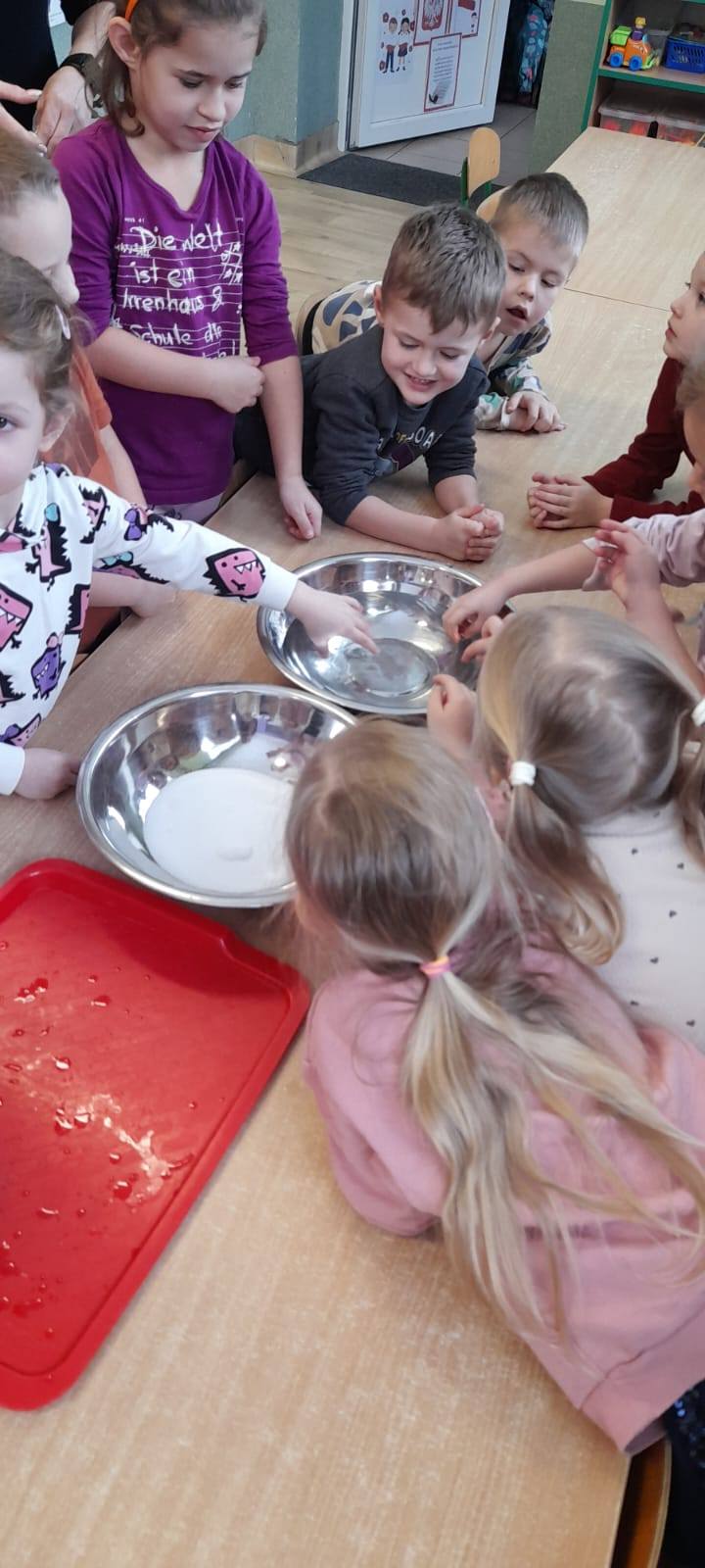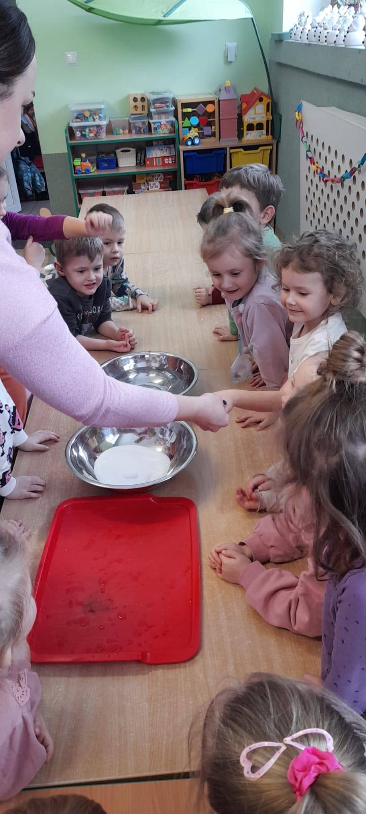 Zima w pełni, więc w przedszkolu przeprowadzaliśmy eksperymenty związane z ulubioną przez dzieci porą roku.
