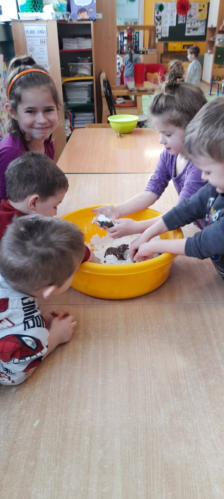 Przygotowaliśmy sztuczny śnieg, w którym dzieci chowały zwierzątka i inne przedmioty oraz przeprowadzaliśmy zimowy eksperyment ,,Jedzenie spod lodu" .