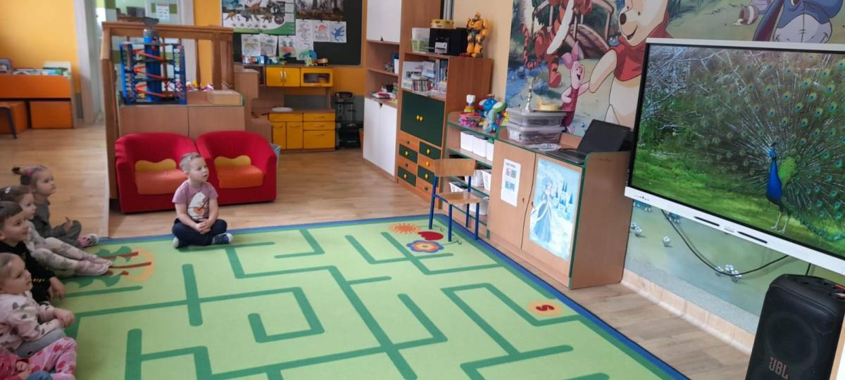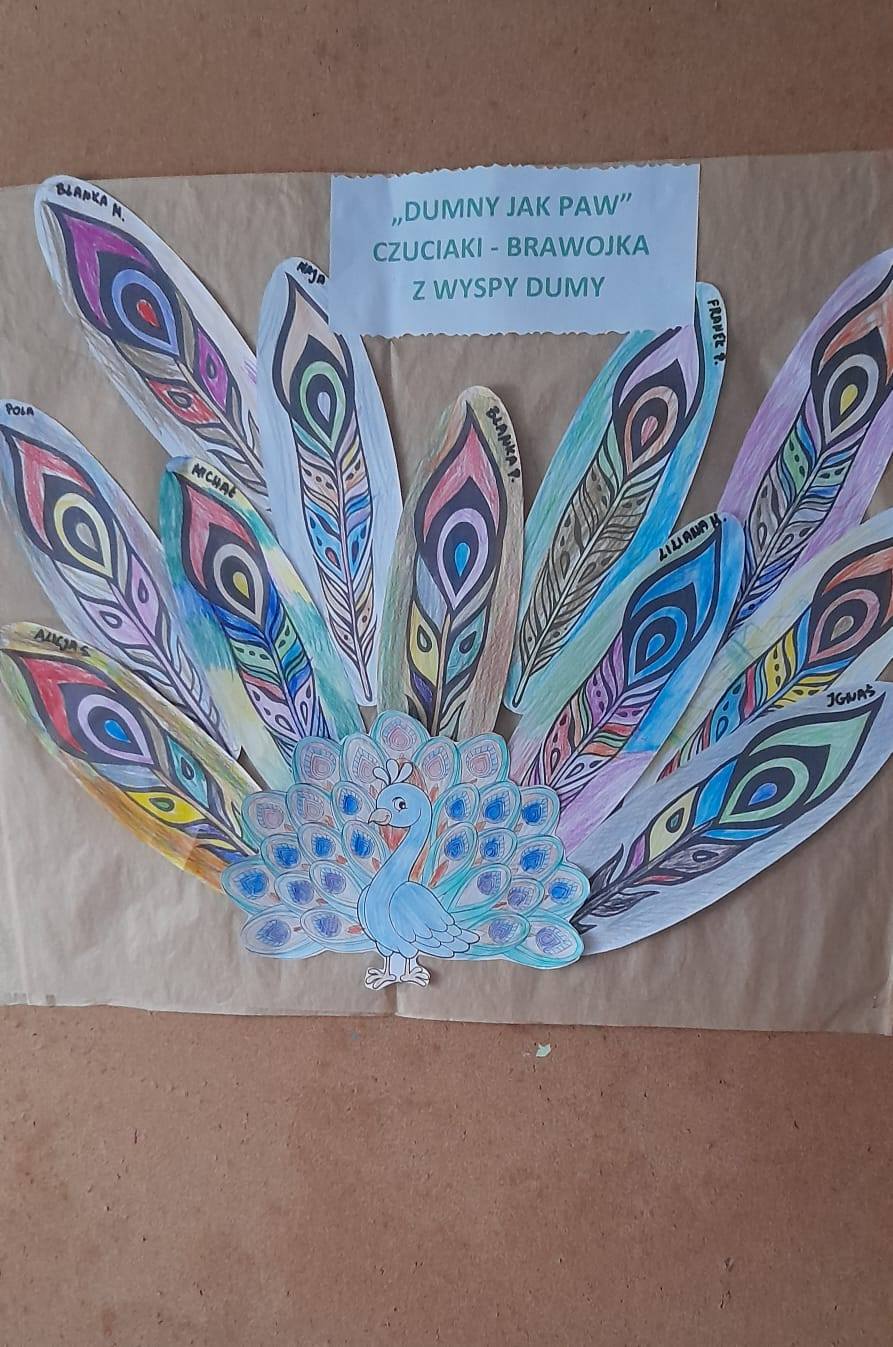 Wykonaliśmy również grupową pracę plastyczną, pt. ,,Dumny jak paw" oraz oglądaliśmy ciekawostki o pawiu. Przedszkolaki poznały znaczenie określenia ,,dumny jak paw".